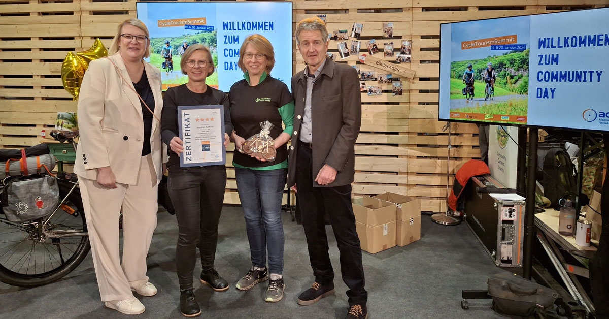 Die Urkunde für die Auszeichnung überreichte der ADFC am vergangenen Wochenende im Rahmen der Messe „Fahrrad- und Wanderreisen“ auf der CMT Stuttgart. Bei einem feierlichen Bühnenprogramm vor einem breiten Publikum nahmen Dagmar Beckmann und Marianne Teltrop vom Naturpark Hohe Mark die Ehrung entgegen. Aus Sicht des Naturparks ist die Auszeichnung ein wichtiges Signal: „Die vier Sterne sind Anerkennung und Ansporn zugleich, unseren Gästen weiterhin eine echte ‚Extraspur Natur‘ zu bieten“, betont Christina Illenseer, Produktmanagement Hohe Mark RadRoute.