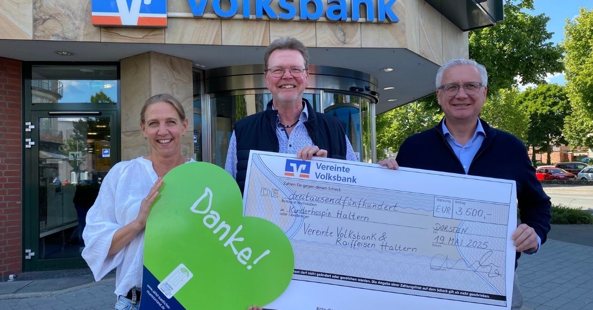 Günter Hessing (Raiffeisen Haltern) und Ingo Hinzmann (Vereinte Volksbank) überreichten jetzt eine Spende in Höhe von 3.500 Euro an Koordinatorin Yvonne Steinbuß. Die Summe kommt der wichtigen Arbeit des Hospizdienstes in der Region zugute, der Familien mit lebensverkürzt erkrankten Kindern begleitet und entlastet.