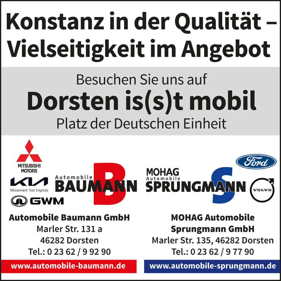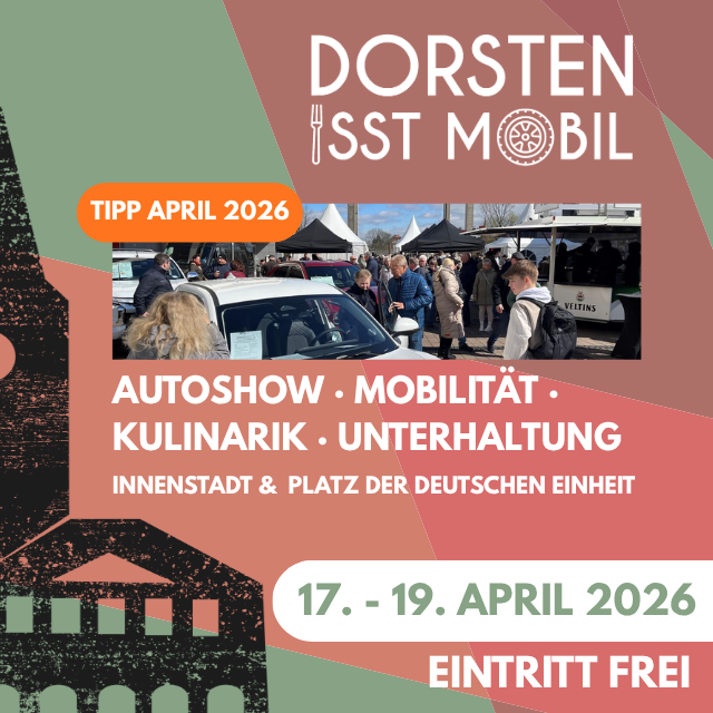 Autos, Streetfood und Frühlingsstimmung: Mit „Dorsten is(s)t mobil“ startet Dorsten vom 17. bis 19. April 2026 in die neue Stadtfest-Saison. Die Innenstadt wird dabei erneut zur großen Erlebnisfläche mit Autoshow, E-Mobilität, kulinarischen Angeboten und einem vielfältigen Programm für die ganze Familie.
