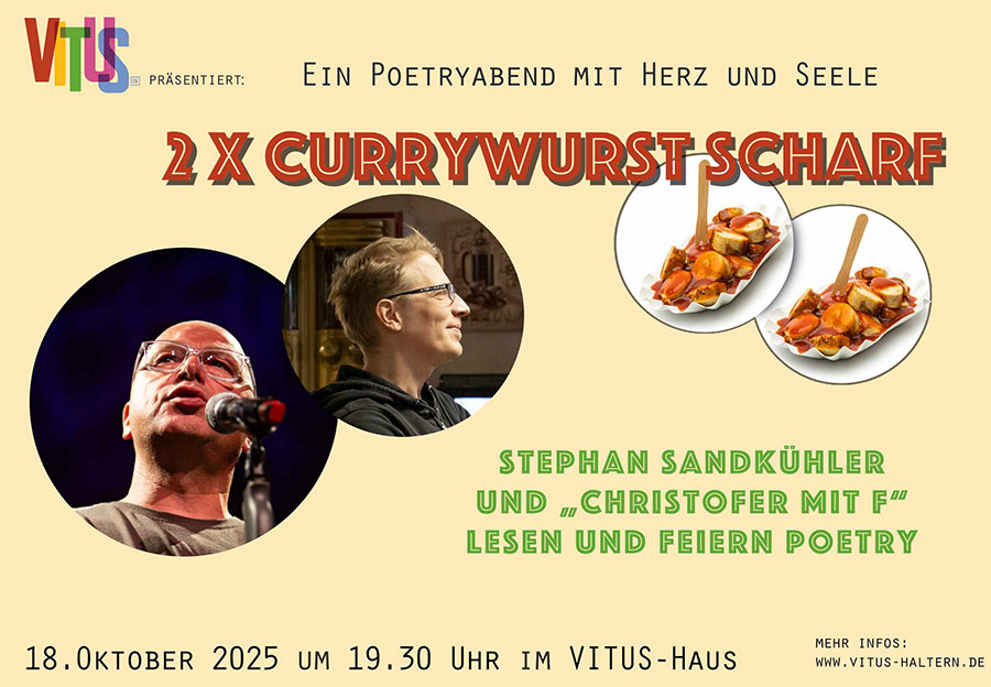Am kommenden Samstag, den 18. Oktober, ab 19:30 Uhr, dürfen sich Poetry-Fans auf eine ganze besondere Veranstaltung im VITUS-Haus Haltern freuen. Unter dem Motto „2 x Currywurst scharf“ wird feine Poetry für alle Freunde des gelesenen Wortes abgeliefert.