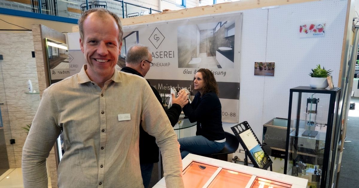 „Auch bei uns geht es ganz um das Thema Energiesparen. An unserem Stand kann man anhand einer Infrarot-Testinstallation mit der Hand selbst erfühlen, wie unterschiedlich das Dämmverhalten von Einfachverglasung, Doppelverglasung und Dreifachverglasung ist.“, so Nicolas Pennekamp (Inhaber der Glaserei Pennekamp aus Haltern am See).