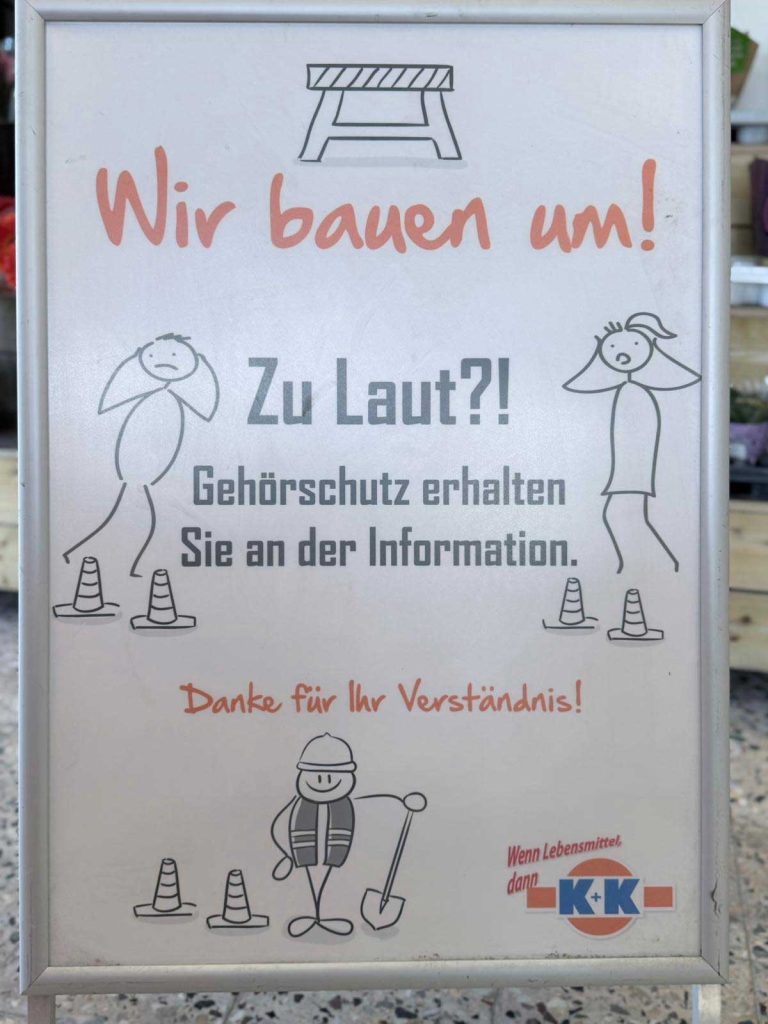 „Wir bauen um! Zu laut?! Gehörschutz erhalten Sie an der Information.“