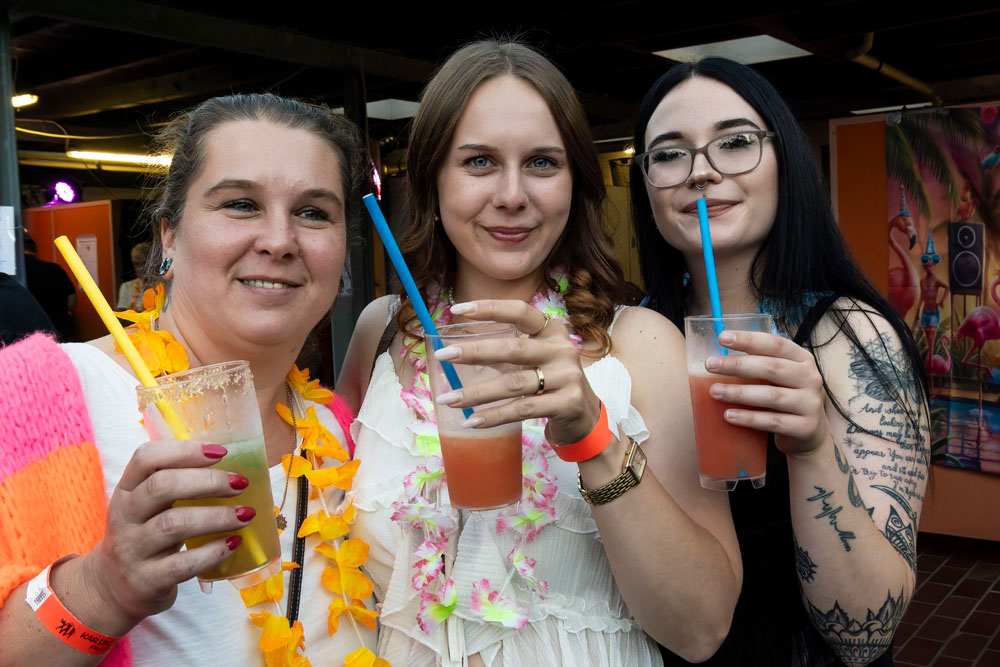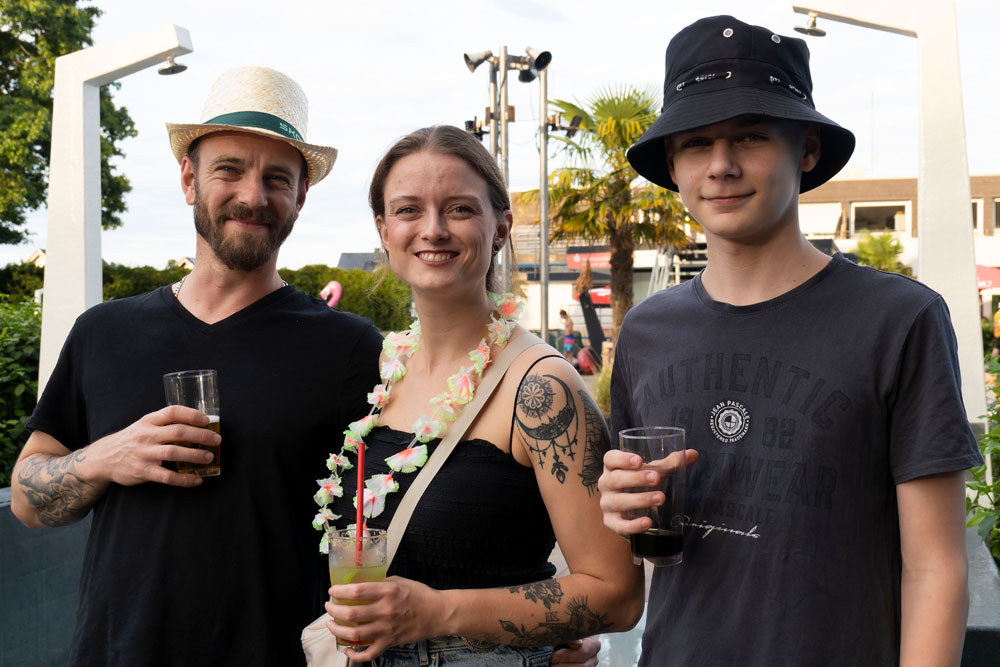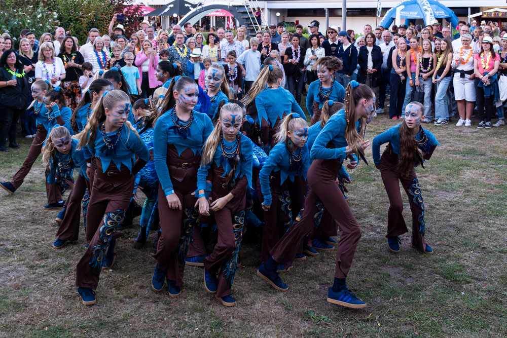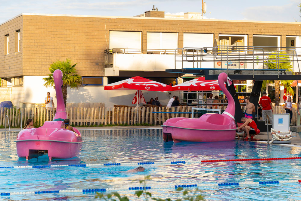 Zwei pinke Flamingo-Boote sorgten für Spaß auf dem Wasser, während sich zahlreiche Jugendliche beim Springen von den Startblöcken ins kühle Nass erfreuten. Zwischen den beiden Becken gab es eine Installation für 3D-Rundum-Selfies. Viele Besucher trugen Hawaii-Hemden und kostenlose Strohhüte wurden verteilt. „Ja, Sythen kann Hawaii!“, so kommentierte ein Besucher die Kulisse der aufkommenden Abendstimmung.
