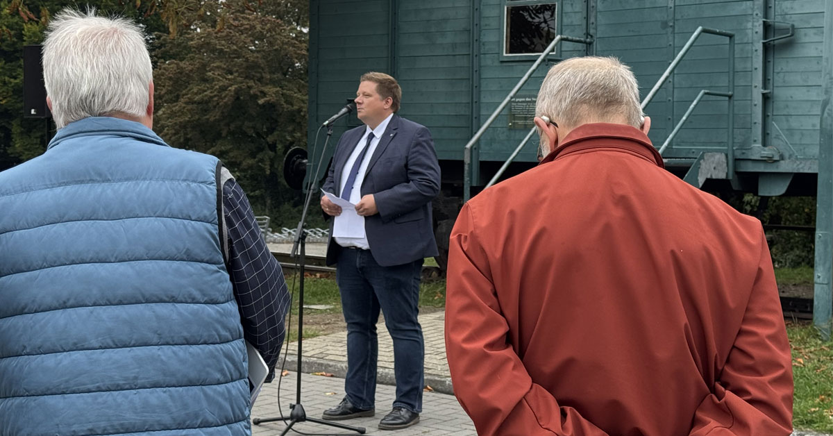 Die Eröffnungsveranstaltung startete mit einem Gedenken am historischen Waggon der Alexander-Lebenstein-Realschule. Bürgermeister Andreas Stegemann betonte in seiner Ansprache die Verantwortung der Stadtgesellschaft: „Die Ausstellung erinnert uns eindringlich daran, was passieren kann, wenn Menschenrechte mit Füßen getreten werden. Wir dürfen die Vergangenheit nicht vergessen, damit sich ihre schlimmsten Seiten nicht wiederholen. Es ist uns eine Ehre, diese wichtige Ausstellung in Haltern am See zeigen zu dürfen.“ Auch die Realschule war an der Gestaltung der Gedenkveranstaltung beteiligt. Schulleiter Frank Cremer äußerte sich im Rahmen der Eröffnung: „Für uns als Schule ist es ein zentrales Anliegen, historisches Bewusstsein zu fördern – nicht nur im Unterricht, sondern auch im öffentlichen Raum. Die Beschäftigung mit dieser Ausstellung gibt unseren Schülerinnen und Schülern die Möglichkeit, sich aktiv mit Erinnerungskultur auseinanderzusetzen.“